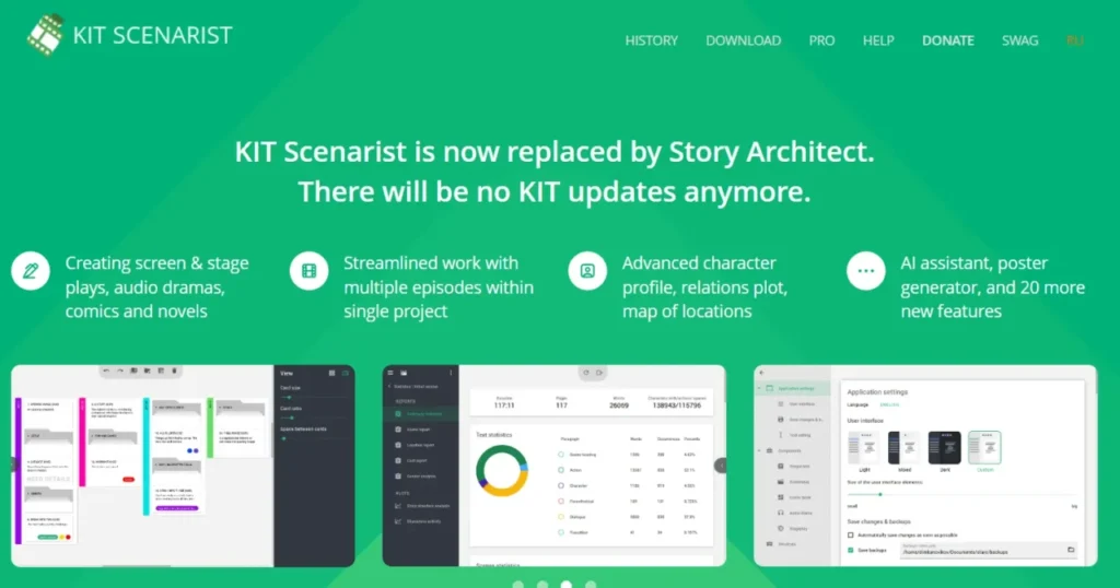 KIT Scenarist is comprehensive tool for script development, allowing users to organize research, character details, and other writing elements in one platform, ideal for complex projects.