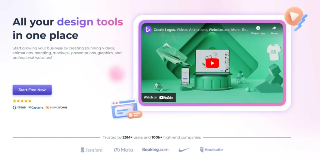 Renderforest is an all-in-one platform for video creation, animations, logo designs, and mockups. It’s great for businesses needing both video and graphic design tools.
